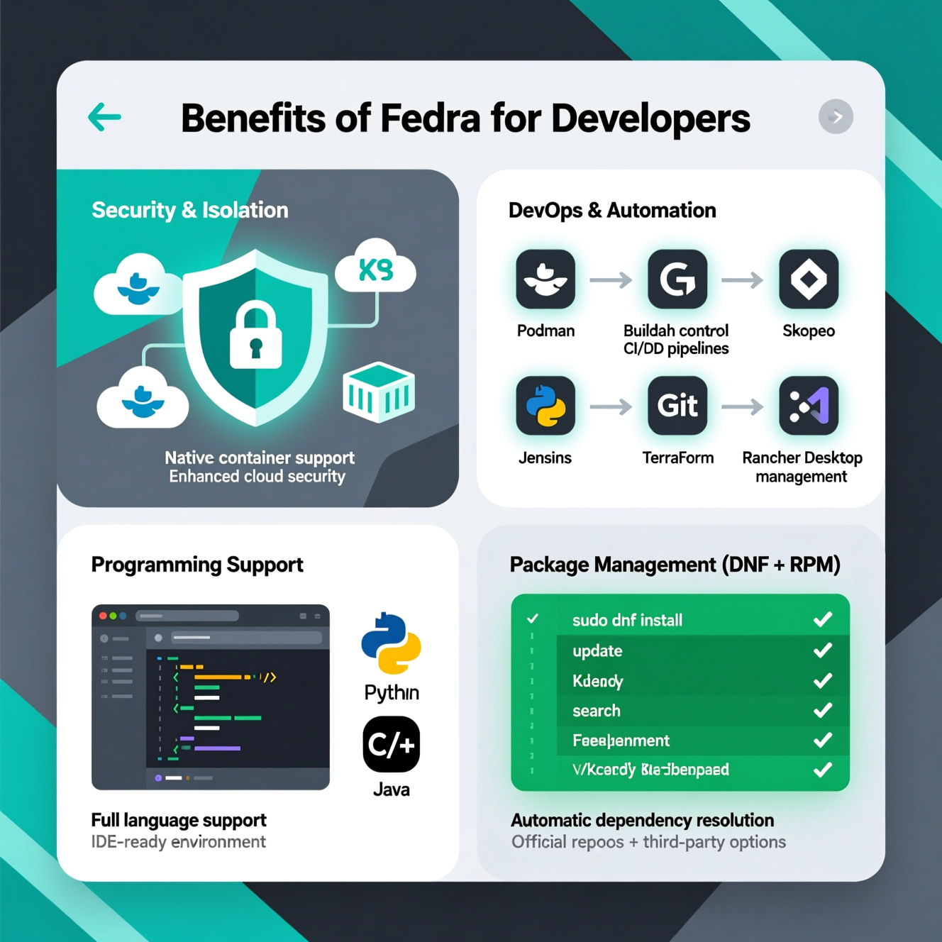 Fedora ممتازة للـ DevOps بفضل دعمها القوي للحاويات والأتمتة: