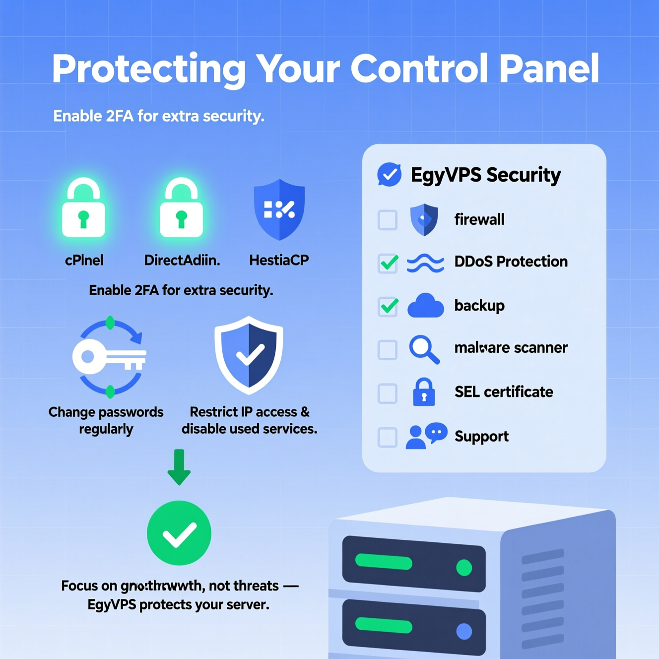 لو بتستخدم cPanel، DirectAdmin، أو HestiaCP، فعّل خاصية المصادقة الثنائية (2FA) عشان تضيف طبقة حماية إضافية.