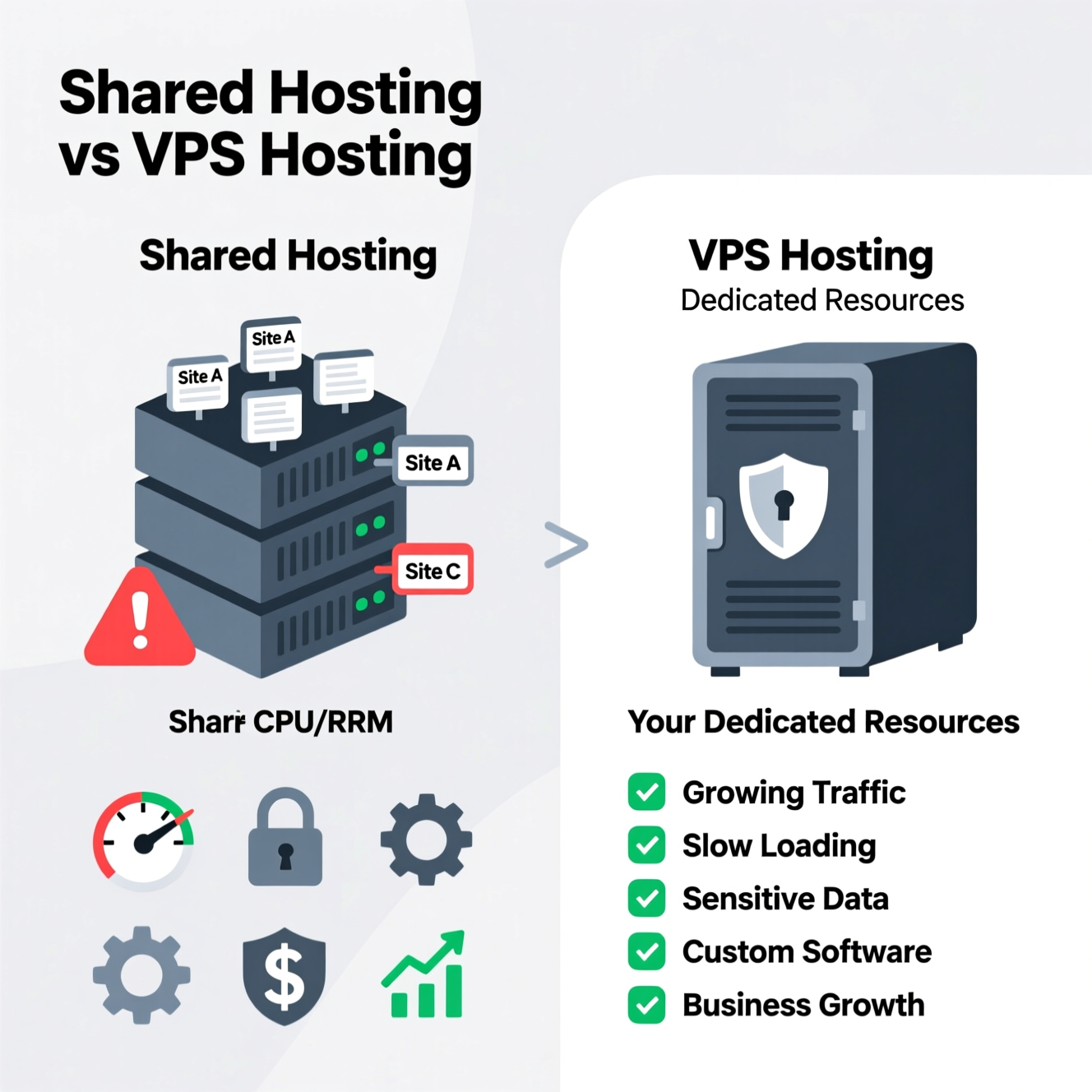 لكن لما تبدأ زياراتك تزيد أو تبدأ تبيع منتجات، وقتها لازم تنتقل إلى VPS علشان تحافظ على الأداء والسرعة.