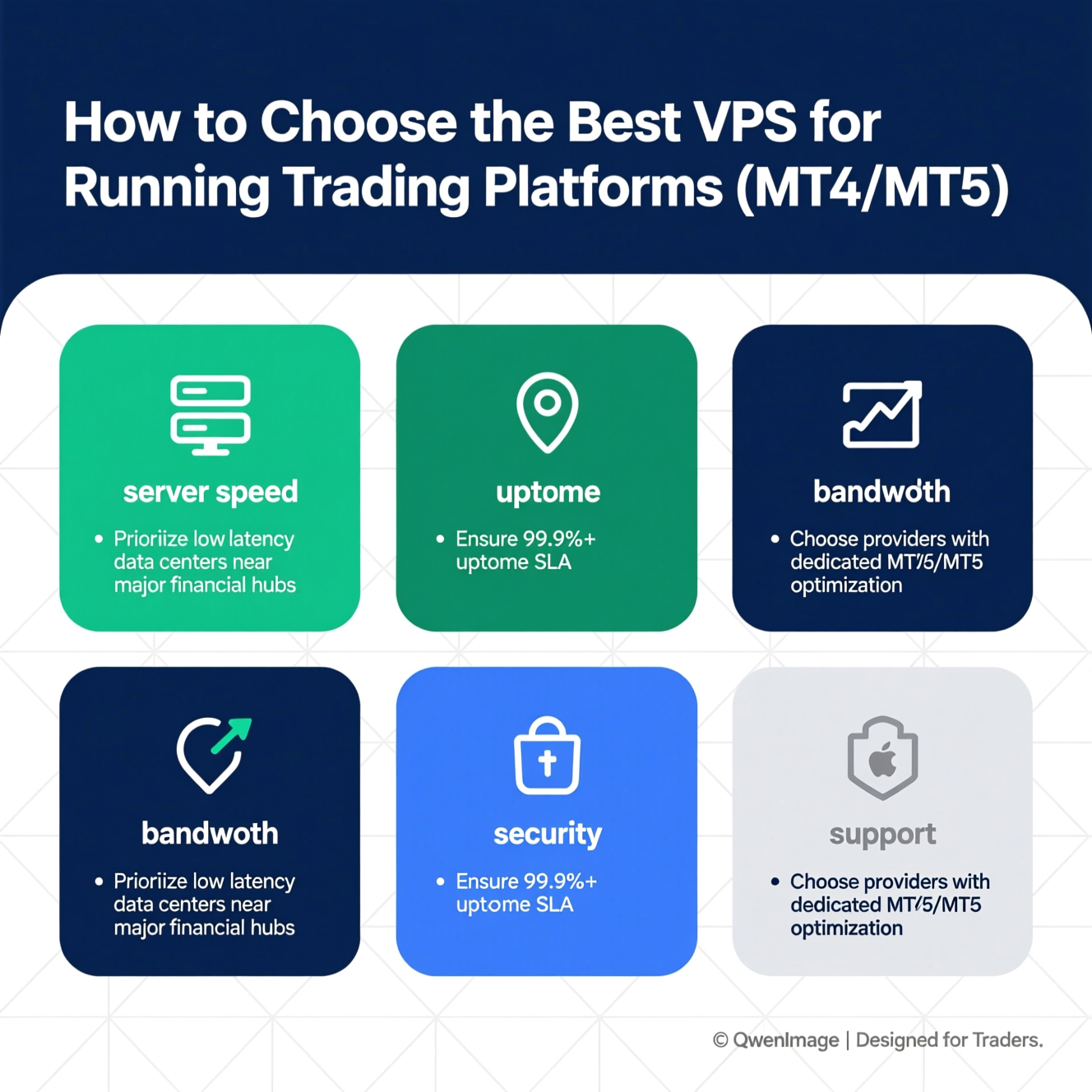 إذا أردت تداولًا ناجحًا: ابحث عن سرعة عالية، بينج منخفض، موارد قوية، موقع قريب من وسيطك، دعم فني ممتاز، وضمان أمان مستمر.