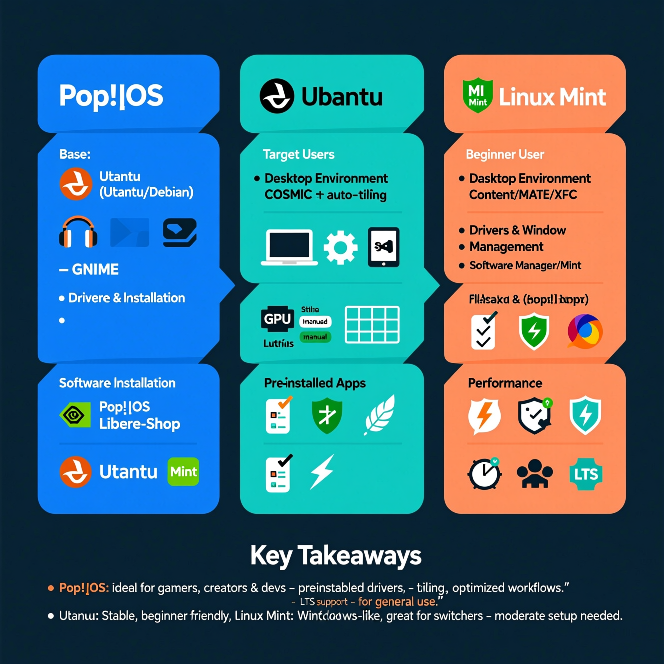 | Feature | Pop!_OS | Ubuntu | Linux Mint |