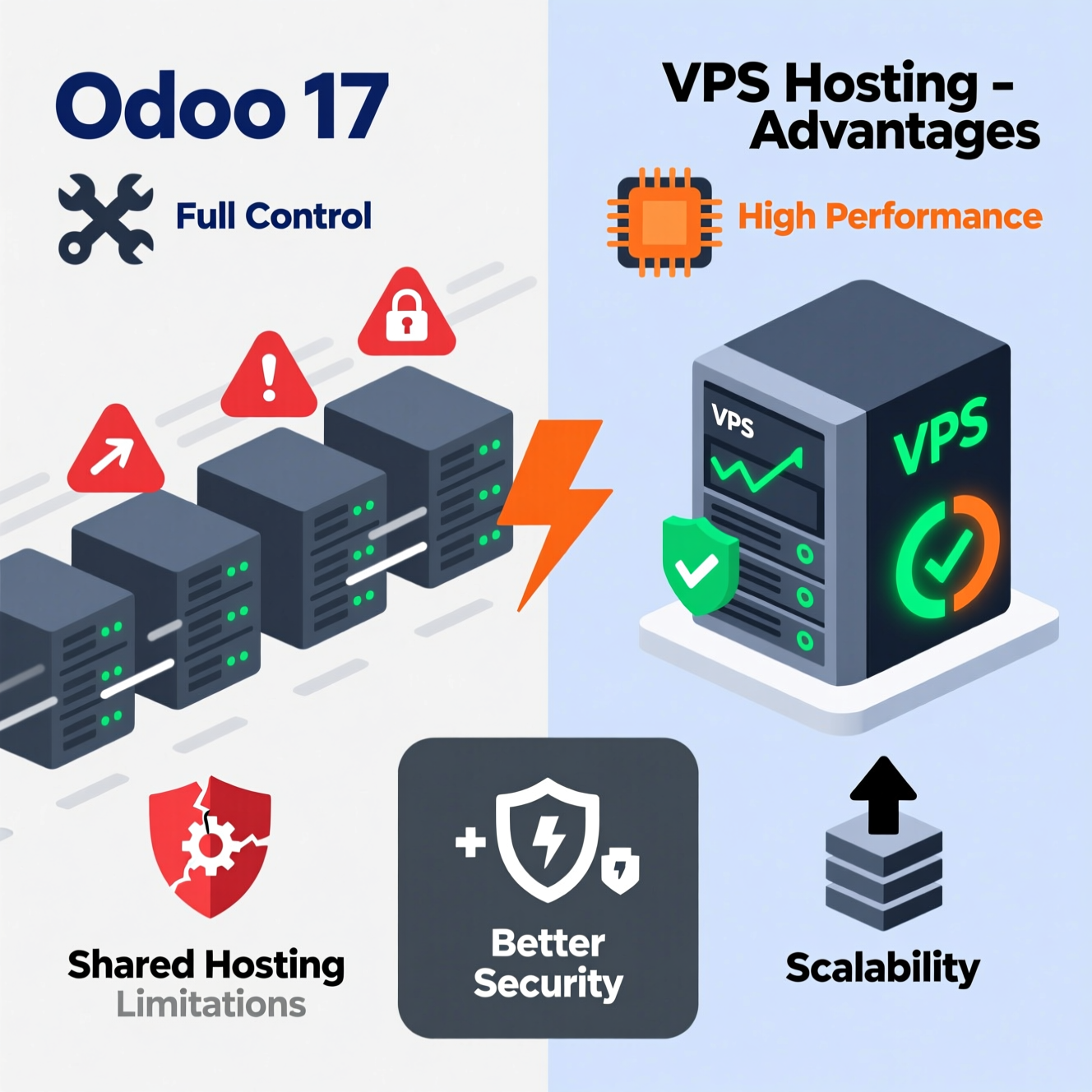 Running Odoo 17 on shared hosting often leads to slow performance, limited customization, and potential security risks.
