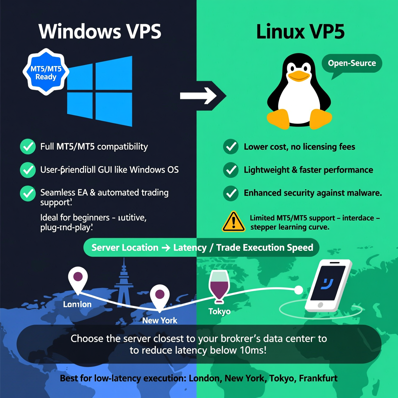 اختيار VPS مناسب لا يعتمد فقط على النظام (Windows أو Linux)، بل على موقع السيرفر وسرعة الاستجابة (Latency). إذا جمعت بين نظام متوافق وموقع سيرفر قريب من وسيطك، ستحصل على أفضل تجربة تداول وأكثر استقرارًا.
