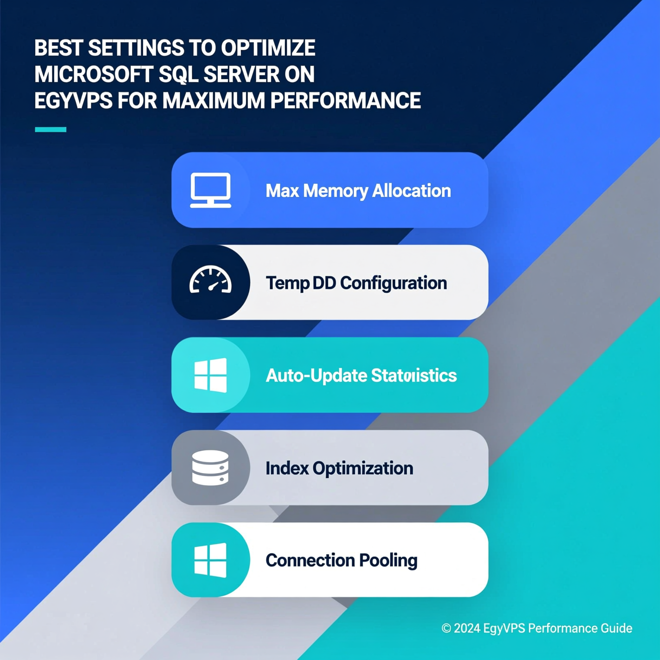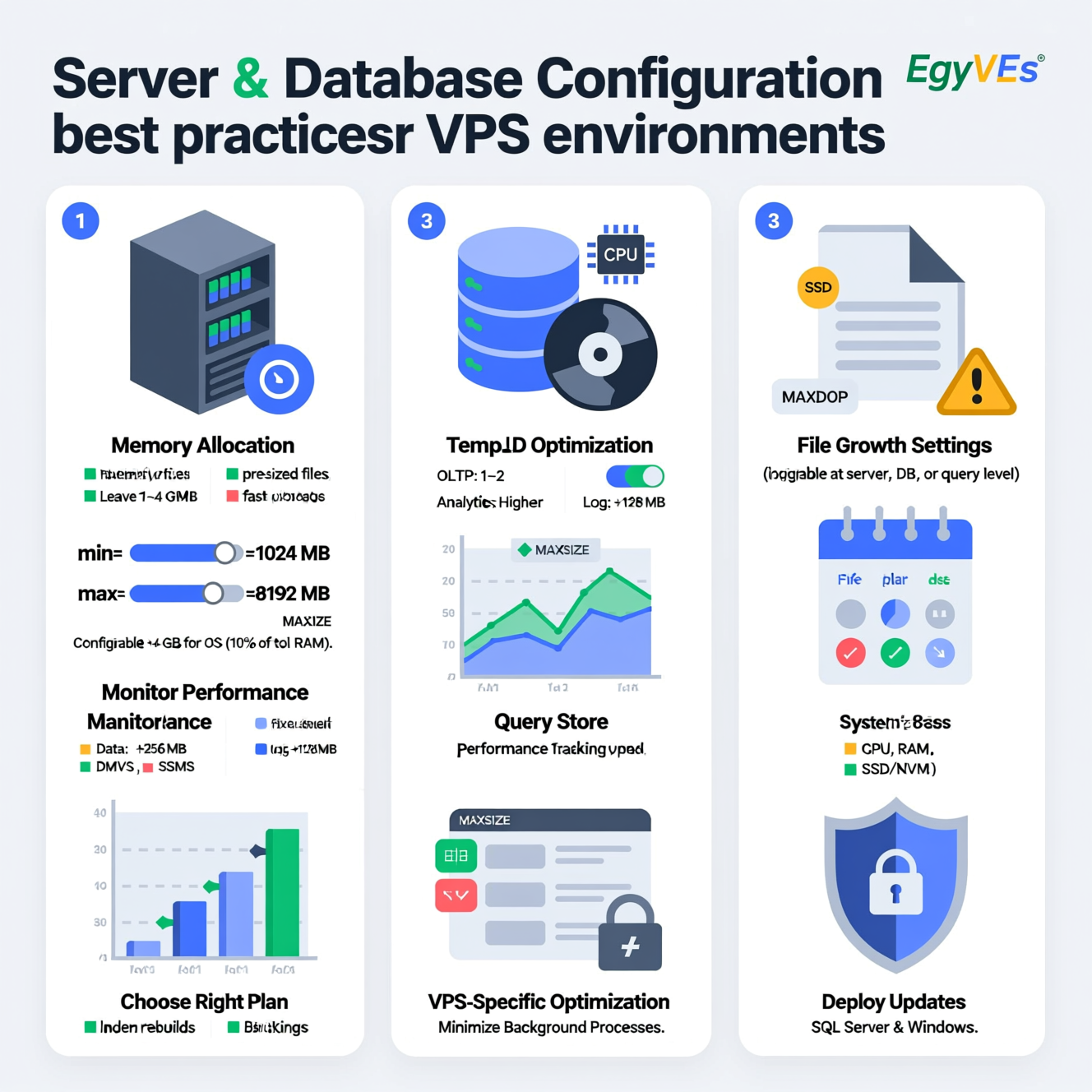 Performance tuning settings for SQL Server on EgyVPS, including memory allocation, TempDB optimization, Max Degree of Parallelism (MAXDOP), and file growth settings.