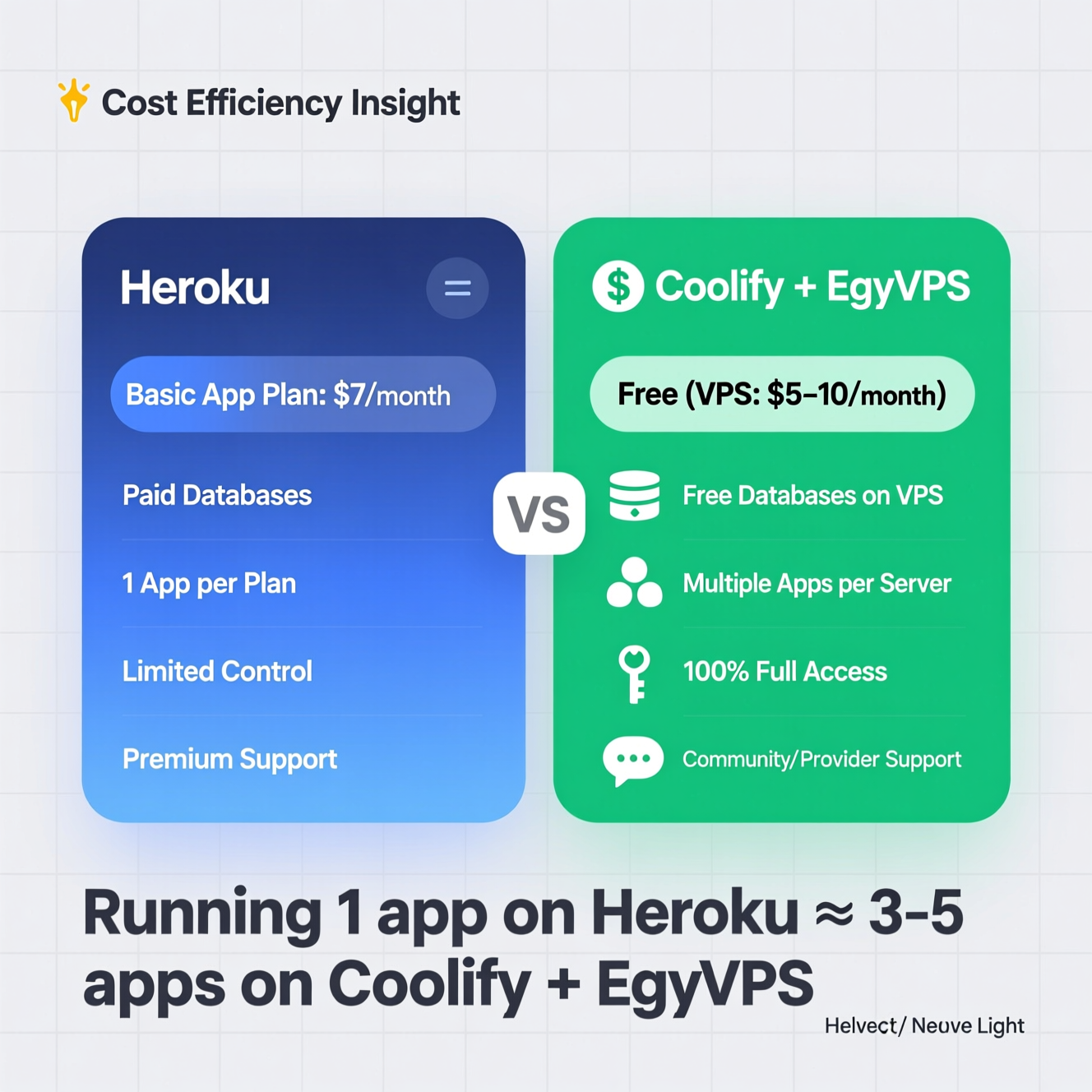 Running 1 app on Heroku costs about the same as 3–5 apps on Coolify hosted through a VPS like EgyVPS.